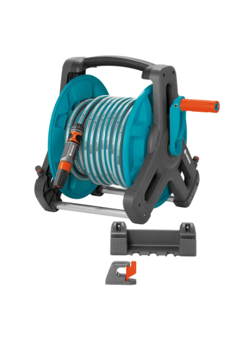 Grâce à son design compact et à sa poignée ergonomique intégrée, le dévidoir se transporte facilement et confortablement. Le support mural robuste permet un rangement gain de place sur le mur. Lors de l’arrosage, le dévidoir peut rester fixé au mur ou être retiré pour une utilisation mobile.