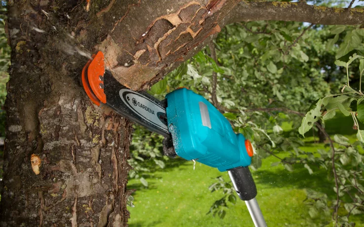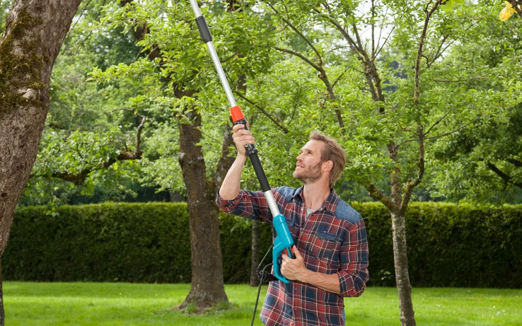 Même les branches situées dans des zones denses de la canopée peuvent être retirées sans effort, grâce à la tête de coupe légère et étroite. La tête de coupe inclinable apporte un confort supplémentaire.
