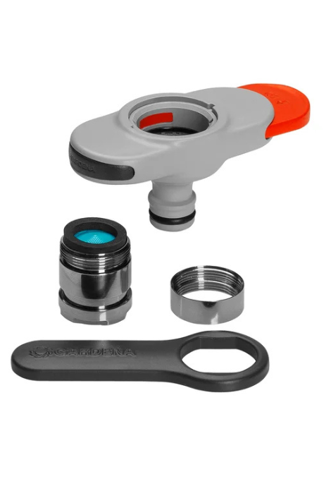 L’installation est très facile : Enlevez l’adaptateur présent dans le robinet grâce avec la clé fournie. Placez ensuite le petit adaptateur GARDENA sur le robinet ; puis l’adaptateur de connexion par-dessus. Verrouillez ensuite ce dernier en poussant la languette (partie orange enfoncée) puis connectez votre tuyau d’arrosage équipé d’un raccord rapide. Pour déverrouiller, poussez la languette dans l’autre sens.