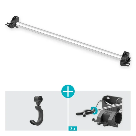 Le support mural PLUS de GARDENA vous aide à ranger vos outils de jardinage en gagnant de la place. Il est idéal pour ranger les grands outils comme les bêches et les fourches ainsi que les produits de la gamme combisystem de GARDENA. Le support est fabriqué en aluminium et peut supporter une charge totale de 60 kg. Les trois supports inclus vous permettent de ranger des outils d’un poids maximal de 10 kg chacun. Pour plus de flexibilité, les supports peuvent être utilisés pour ranger les accessoires combisystem et Original GARDENA System. Le crochet universel est adapté au rangement d’outils de coupe et électriques tels que les taille-haies ou les souffleurs. Il peut supporter un poids maximal de 5 kg. Grâce au support mural verrouillable, vous pouvez rétracter la barre en aluminium et étendre votre support pour ranger davantage d’outils. Le support mural PLUS bénéfice d’une garantie commerciale fabricant de 25 ans après enregistrement du produit sur gardena.com/registration dans les 3 mois suivant l’achat.