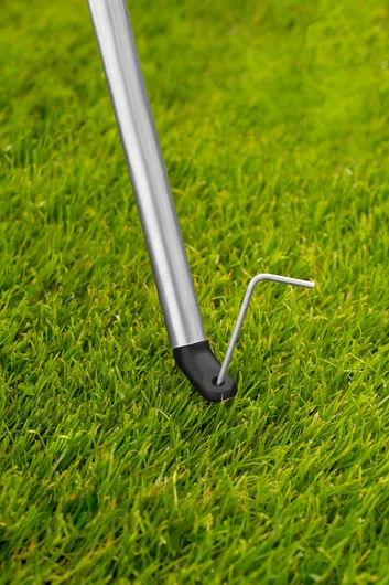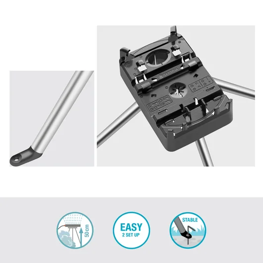 Le montage peut se réaliser facilement sans outil. Les pieds sont repliables pour un rangement compact. Pour garantir une bonne stabilité, trois pics métalliques sont fournis pour permettre d’ancrer le trépied dans le sol. Les différents types d’arroseurs peuvent être facilement installés grâce à un système d’emboîtement. Les instructions relatives à la fixation des systèmes d’arrosage sont indiquées sur le support.